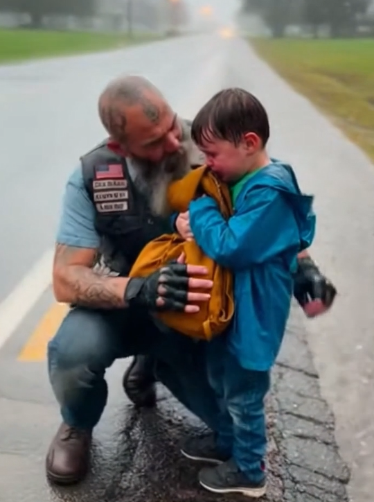 As Jake cruised past the guardrail, something made him slow down. A small figure stood alone near the edge of the pavement, not waving, not begging for help—just standing there like the world had stopped caring. The boy, no more than ten, clutched a worn backpack with both hands. Rain streaked across his face, mixing with something deeper: fear, exhaustion, and the kind of loneliness that hits harder than any storm.