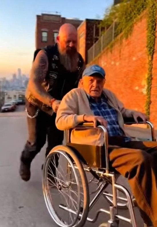 He moved behind the wheelchair, his hands—big and tattooed yet surprisingly gentle—gripping the handlebars. His boots dug into the concrete, and they started their climb.