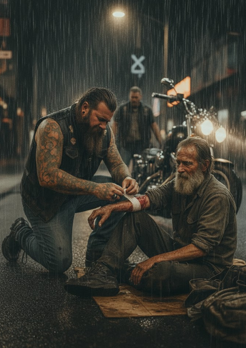 His Harley idled beneath a flickering streetlight, the rain cascading off its chrome surface. Kneeling on the soaked asphalt, Hammer’s attention wasn’t on his bike but on an elderly homeless man sitting on a piece of cardboard — cold, shivering, and clutching a bleeding arm.