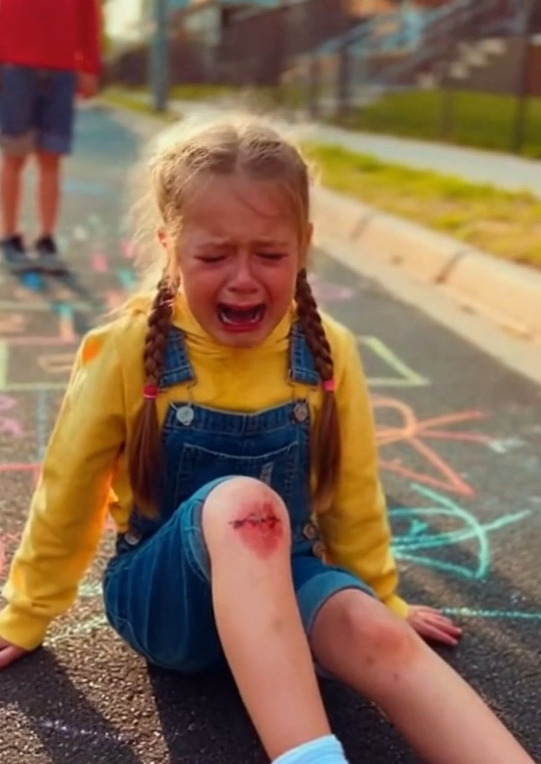 A little girl, no older than six, stumbled forward and hit the pavement hard. Her backpack slid off, her palms scraped raw, and her tiny face twisted in a mixture of pain and humiliation. Behind her stood another child—arms crossed, chin lifted, the kind of posture kids wear when they don’t know what to do with guilt.