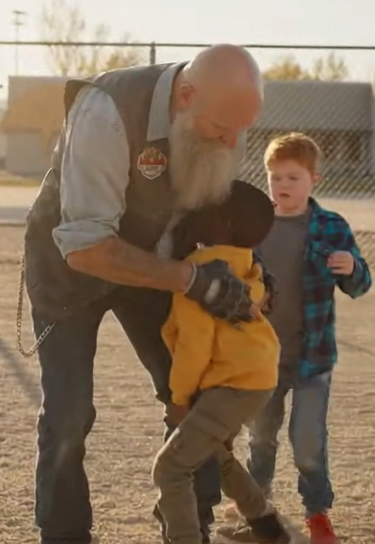 Sometimes, courage looks like a biker kneeling in a schoolyard, teaching the next generation how to treat each other with respect, dignity, and heart.