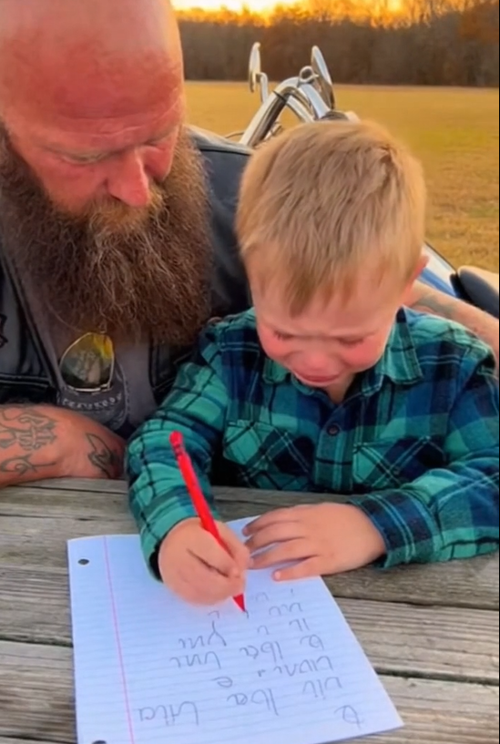The biker noticed the boy immediately—not because of noise, but because of silence. While the rest of the park buzzed with movement, this child looked frozen in a world of his own. His hands shook slightly as he wrote, and every few lines he wiped his eyes with his sleeve.