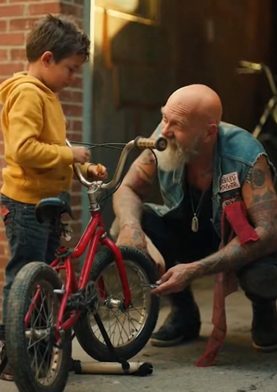 With practiced hands—hands that had repaired engines, gears, and even the spirits of friends on rough days—the biker inspected the problem. He guided the chain back into place, tightened a bolt, and straightened the wheel. The boy watched him with wide eyes, soaking in each movement like he was seeing a miracle unfold.