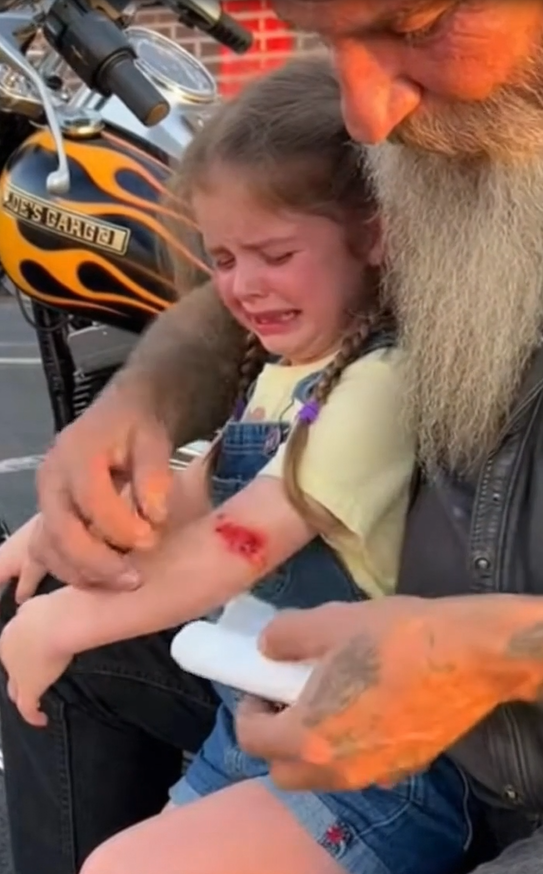 She sniffled and nodded, still clutching her elbow. In that moment, everything about him shifted. Gone was the hardened biker image; in its place was a man who knew exactly how to comfort a hurt child.