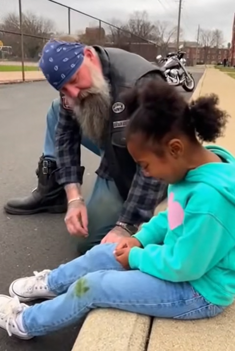 A few feet away, a group of kids snickered. One of them twirled a pink hair tie around his finger like it was something he’d won, not something he’d taken. The biker’s jaw tightened as he watched the little girl tug at a stray curl, trying to hide it as though it were something wrong instead of something beautiful.