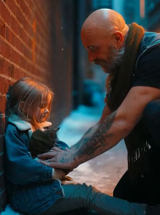 Ryder parked his motorcycle and stepped toward the alley, the crunch of gravel under his boots the only sound in the empty street. Leaning against a brick wall was a little girl, maybe seven years old, knees drawn tightly to her chest. She held a tiny gray kitten—its fur tangled, its body trembling from the cold. The girl didn’t look much warmer herself, her thin jacket barely enough to shield her from the wind.