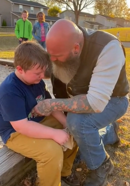 The biker glanced at the group snickering nearby, then back at the boy—his expression shifting from curiosity to something protective.
