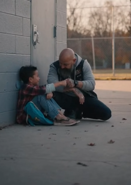 The biker knelt so their eyes met, every bit of his voice firm, steady, and warm.