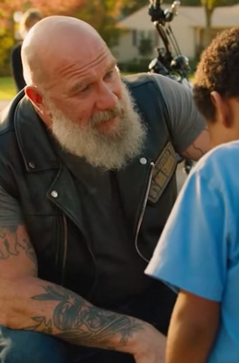 The biker placed a gentle hand on the boy’s shoulder.