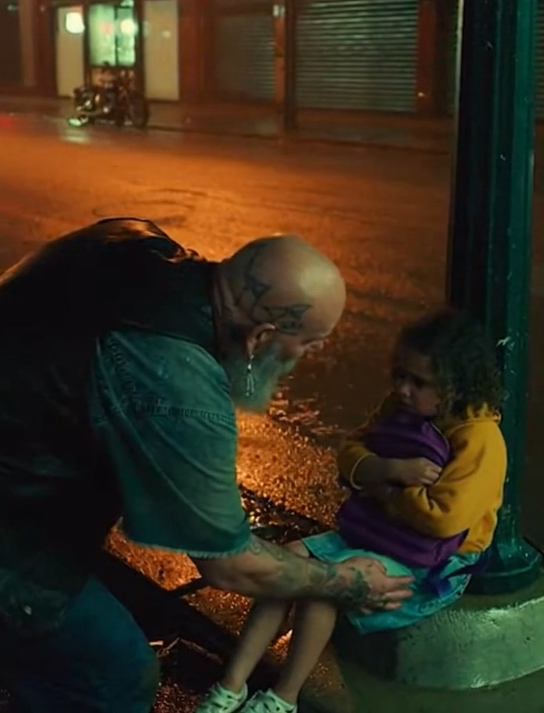 The sky was dimming, streetlights flickering awake one by one as Bear coasted down the quiet stretch of road. He wasn’t looking for trouble. He wasn’t looking for anyone. But sometimes the road puts something in front of you that makes you stop—no matter how tough, tired, or distant you think you are.