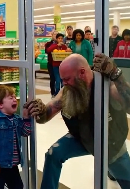 Every supermarket has its own rhythm—shopping carts rattling, kids asking for candy, cashiers calling the next customer in line. It’s a place where people rush through their errands without paying much attention to anything outside their lists. But every now and then, something happens that freezes time. Something that reminds us that heroes don’t always wear uniforms. Some ride motorcycles, wear worn leather jackets, and simply happen to be in the right place at the right moment.