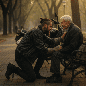 The golden light of late afternoon spilled through the park, painting everything in a soft amber hue. The hum of a Harley engine faded as Jake “Iron”…