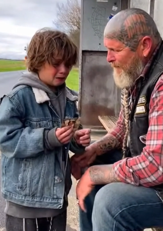 Those words broke down whatever walls the boy had left. He leaned into the biker’s vest, crying harder, and the biker wrapped him in a firm but gentle embrace. He rubbed comforting circles on the child’s back, grounding him through the storm.