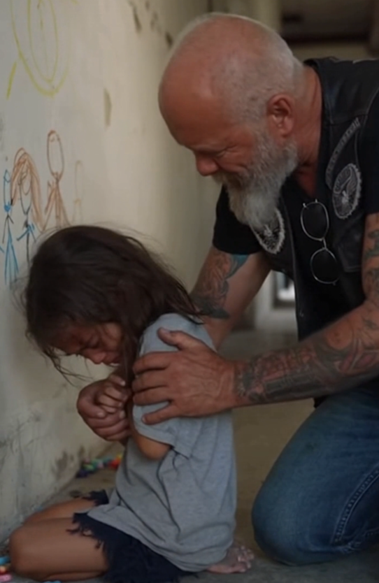Across the street, the low rumble of a Harley-Davidson broke the stillness. The sound rolled through the air like thunder. A tall man in a black leather vest pulled up, dust swirling around him. His beard was streaked with gray, his arms marked with tattoos — each one a story of a battle fought, a road traveled.