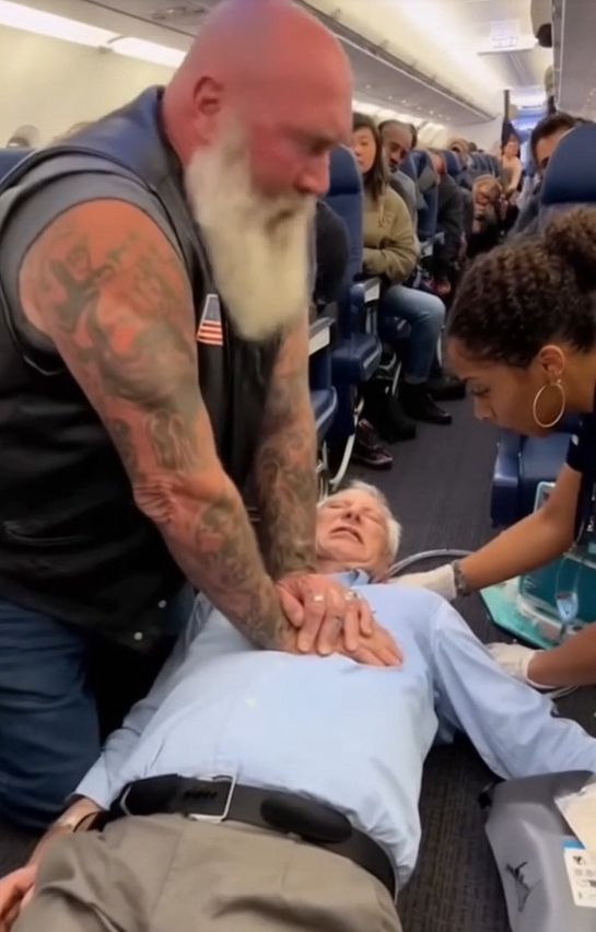 Word spread fast through the cabin. Passengers whispered about “the biker who saved a man’s life mid-air.” Some called him a guardian angel on two wheels—though today, his wings were made of steel and courage, not leather and chrome.