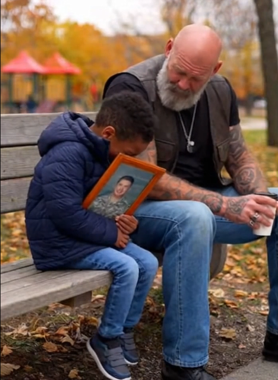 Bear had passed countless parks in his lifetime, but this one stopped him cold. A boy—eight, maybe younger—sat alone on a wooden bench with a framed photograph pressed tightly to his chest. Most kids fidget, swing their legs, or look around. Not this one. He didn’t move an inch. He held that photo like it was the last solid thing in his world.