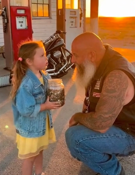 When he pulled into a small gas station to grab a drink, he noticed a little girl standing near the snack machines. She clutched a glass jar full of loose change—mostly pennies, a few nickels, and one worn dollar bill. Her shoulders were tense, her eyes uncertain, and her fingers tapped the jar nervously as if she were rehearsing courage one heartbeat at a time.