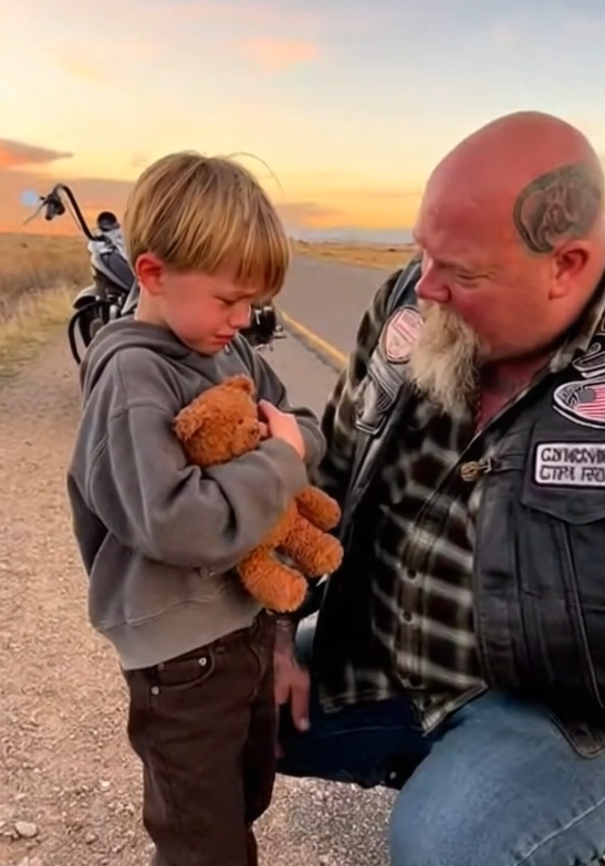 The boy hiccupped through his answers, pointing, guessing, trying his best. His words didn’t always make sense, but the bikers listened carefully. One of them made a phone call, speaking softly, focused and calm.