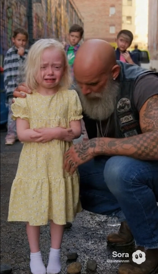 Without hesitation, he ran toward the alley, boots pounding the pavement. The older kids paused, sensing his presence, but the moment they saw him — the tattoos, the leather vest, the imposing frame — they scattered.