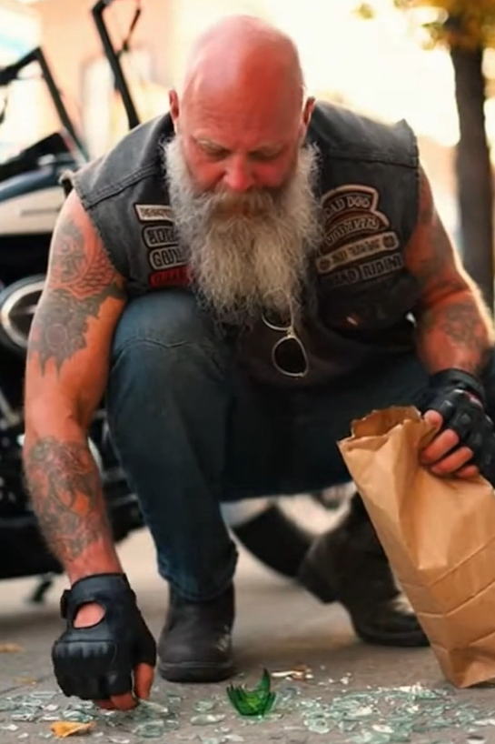 The biker walked straight toward the broken glass, crouched down, and picked up the first shard with careful fingers. He treated it with respect, like something that mattered—because to him, it did. Every fragment was a potential injury. Every sliver was a problem waiting for the wrong foot to find it.