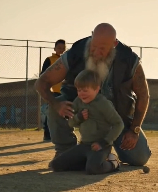 He brushed the dirt from the boy’s arms with a clean bandana, taking his time, showing a kind of patience that didn’t need to be explained. It was the kind of gentleness you’d never expect from a man with leather, tattoos, and the look of someone carved from the road.