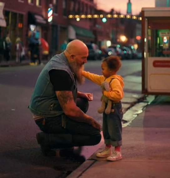 Most people wouldn’t expect a man with road-dust on his boots, leather gloves, and a beard shaped by a thousand miles of wind to sit down on cold pavement for a scared child. But this biker wasn’t like most people. He cut the engine of his Harley, walked over slowly, and crouched down so he wouldn’t tower over her.