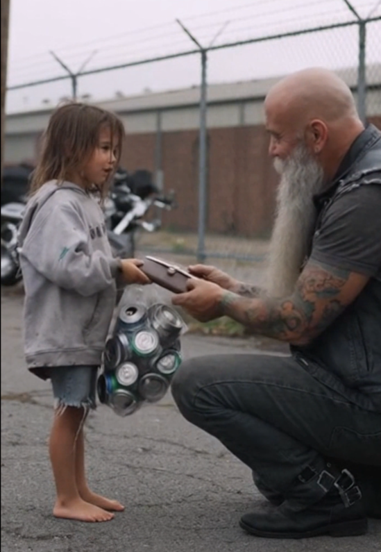 The biker looked her over — the dust on her legs, the sweat on her face, the plastic bag of cans slung over her shoulder. His heart softened.