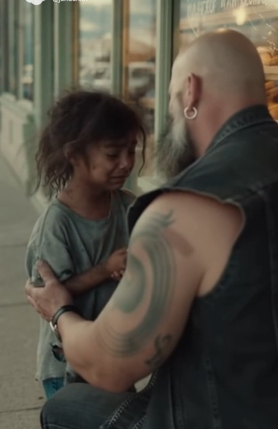 As he waited for his order, Bear’s eyes caught movement outside — a small girl standing still, staring through the glass like she was watching a dream she couldn’t touch. The way she looked at that bread struck him hard. He’d seen hunger before — in alleys, under bridges, in the mirror on bad days — but there was something about this little girl’s quiet, dignified longing that felt different.