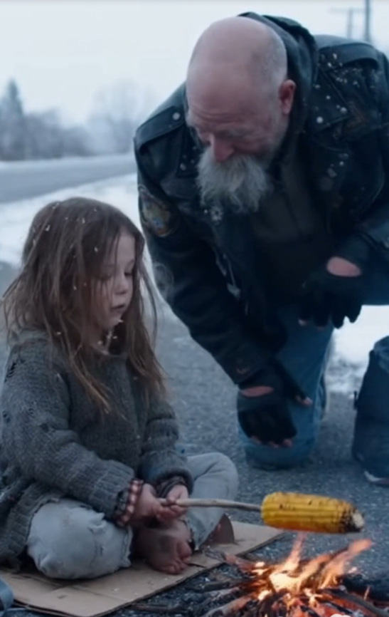The biker’s eyes softened. He looked at her hands — red, trembling, raw from the cold — and then at the small pile of corn she was trying so hard to sell.