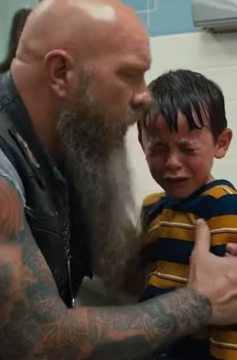 The biker knelt beside him, one large hand steady on the boy’s back.