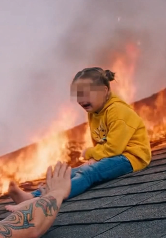 The little girl coughed, her tiny hands gripping the roof’s edge. “It’s too hot!” she cried.