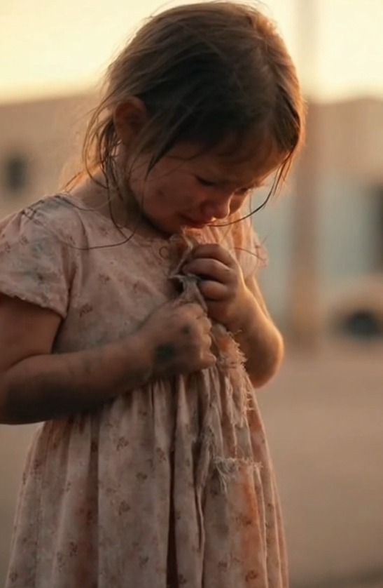 As he approached the entrance, he saw her—a little girl, no more than seven, standing alone near a patch of grass. Her pink dress, once bright and tidy, was now torn at the hem, the stitching undone and dirt smudged across the fabric. She held the ripped corner in both hands, studying it like it was the end of the world.