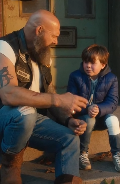 The biker looked like someone most people would avoid—shaved head, thick beard, heavy boots, and a sun-worn leather vest that told stories of long roads and rough winds. But the sound of a child crying cut right through him. He approached the boy slowly, lowering himself until he was eye-level.