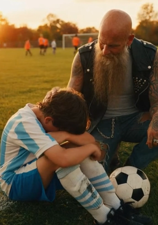 He noticed the kid long before the kid ever knew someone was watching. After hours of riding, the biker had pulled into the park just to stretch his legs and enjoy a cold drink. But across the field, sitting alone on metal bleachers, was a boy—around ten years old—still wearing a bright soccer jersey and cleats that dangled helplessly over the edge. His shoulders sagged, his chin pointed at the ground, and his entire posture looked like defeat itself.