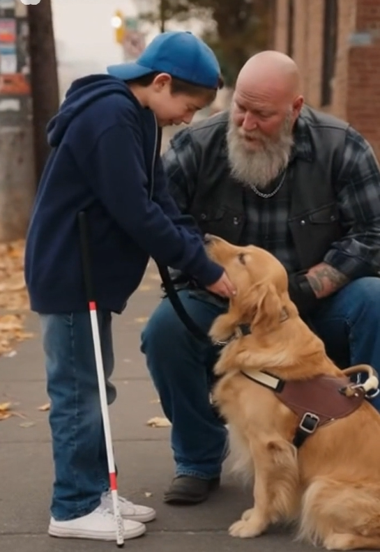 A few days later, Tank arrived at Jimmy’s grandmother’s house, the roar of his Harley announcing his arrival. Jimmy was sitting on the porch, cane resting beside him, waiting for Tank. When Tank approached, he was holding a leash, and at the other end, a calm, black Labrador sat obediently.