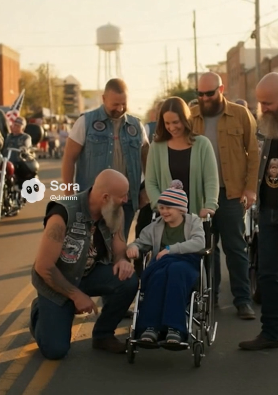 Big Joe Ramirez, president of the Iron Hearts MC, stood at the head of the crowd, his leather vest glinting in the Texas sun. Beside him sat Eli in his wheelchair, a tiny leather vest across his frail frame that read “Little Rider.” His face, pale from the illness, still held the kind of smile that could light up a room.