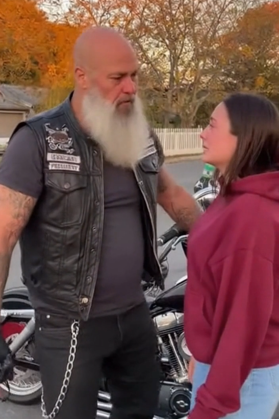 The moment she saw him, she ran straight into his arms, sobbing. Her friends — the same ones who whispered behind her back — watched in silence as this “biker dad” held his daughter tighter than life itself.