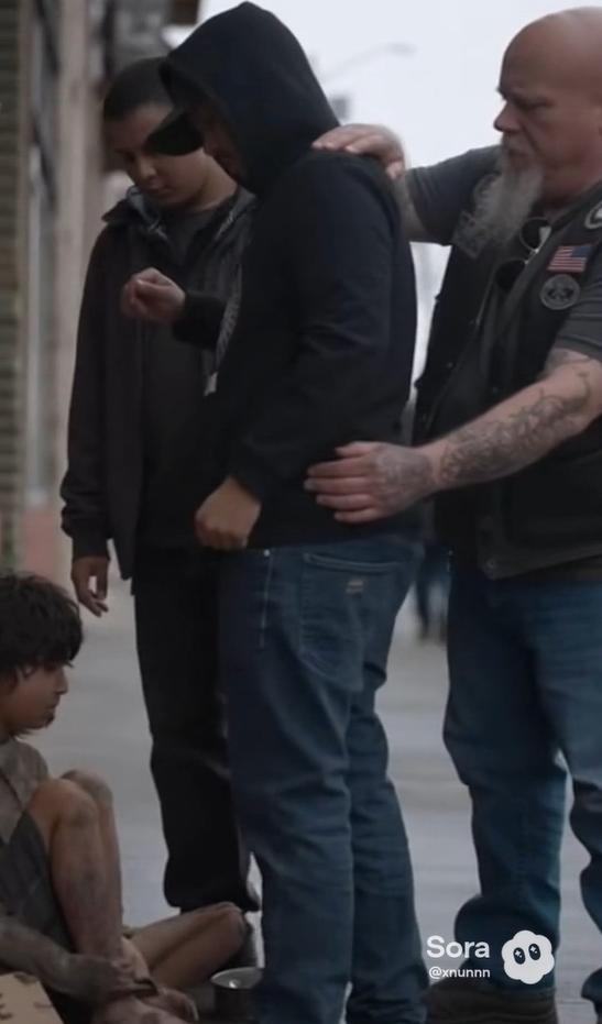 By now, a small crowd had gathered. Some had seen what happened; others had only caught the end — the biker kneeling beside a blind boy, placing money into his cup.