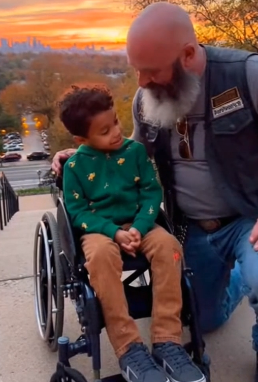 The biker had just finished fueling his Harley when something caught his eye near the old pedestrian bridge. A young boy, maybe ten or eleven, sat in a wheelchair at the base of a long flight of concrete steps. His muddy wheels, slipping backpack, and trembling hands told part of the story.